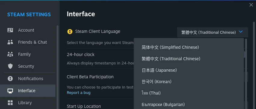 點選Steam左上角 → Settings → Interface,切換語言為中文。