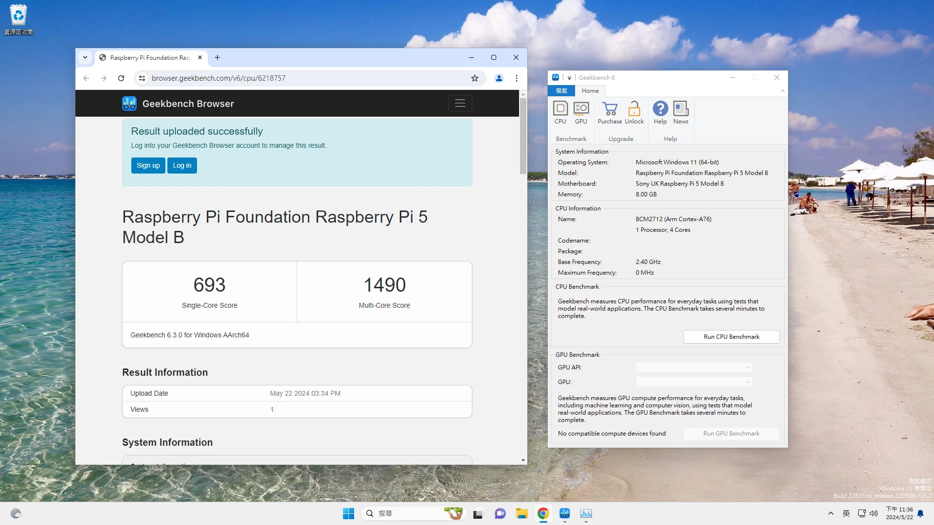 因為GPU沒有運作,只能測試純CPU速度。Raspberry Pi 5搭載的是ARM架構的Broadcom BCM2712處理器,Geekbench 6 (ARM64版) 跑出來的分數跟在Raspberry Pi OS上跑差不多。如果硬要跟x86架構的CPU比較,那這個分數大約是Intel Pentium G4560的等級。