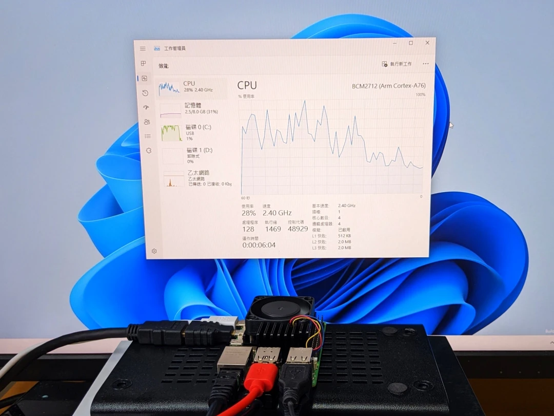 Raspberry Pi 5 8GB,外接鍵盤、滑鼠、螢幕。必須加風扇,Windows很吃效能。