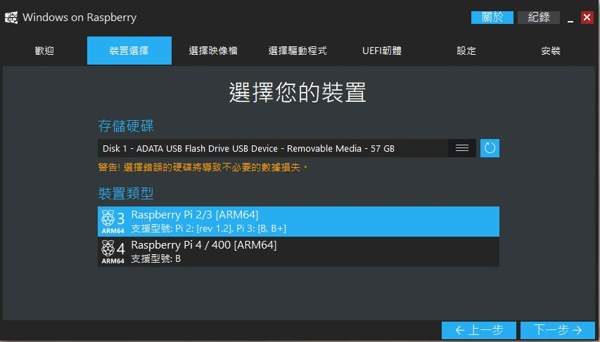 選取要安裝的磁碟,型號選取Raspberry Pi 2/3(經實測選Raspberry Pi 4會導致