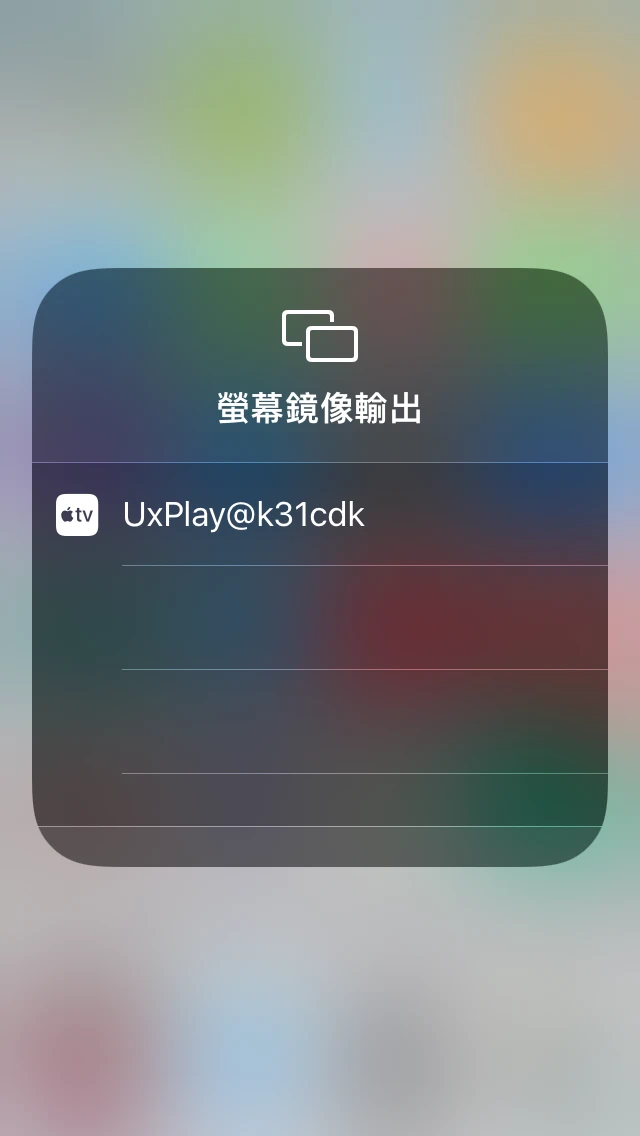 開啟iPhone的控制中心,點選投放,會在列表看到uxplay+電腦名稱的裝置