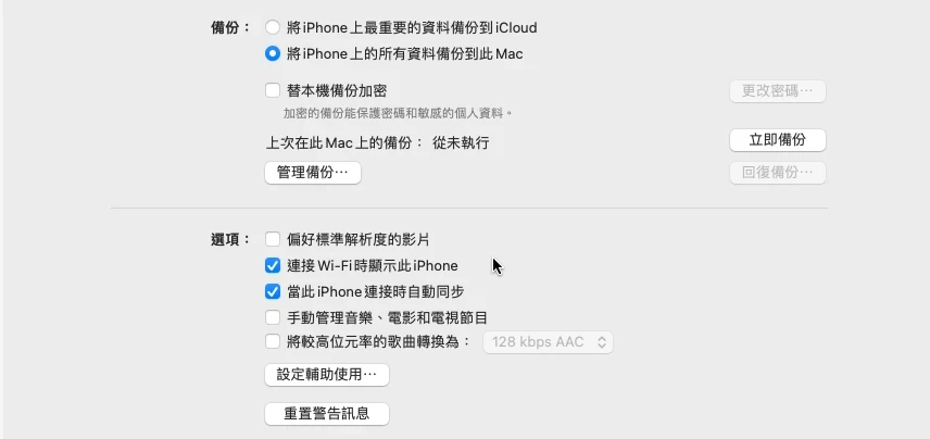 點選Finder左側的iPhone,勾選「連接Wi-Fi時顯示此裝置」