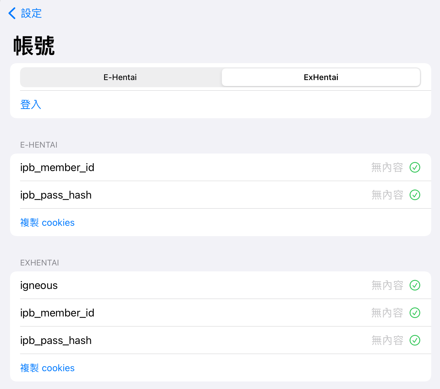 開啟EhPanda,點選右下角的設定,在「帳號」下方點選「Ex-hentai」,之後登入E-hentai帳號。