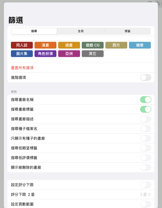 「搜尋」頁面點選右上角篩選,還可以將常用搜尋字串儲存為快速搜尋。至於標籤搜尋技巧請參閱E-hentai網頁版使用教學。