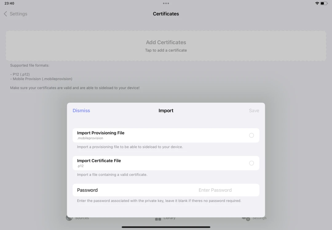 注意: Feather不支援免費開發者帳號,意即不適合透過AltStore安裝。你必須要註冊Apple開發者付費帳號,取得.p12以及.mobileprovision檔案才能使用此APP。Feather不提供免費開發者憑證,你得自己準備。
