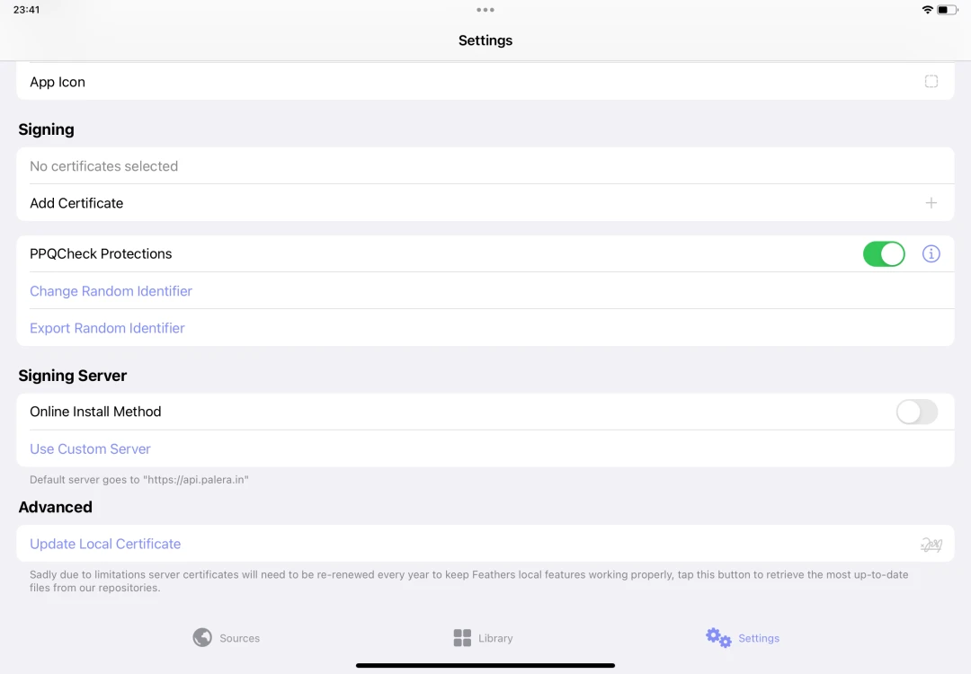 這裡要注意,Feather會在所有安裝的APP Bundle ID後面加上隨機字串,這是為了防止Apple偵測到你安裝的是破解版IPA(若跟App Store上的APP Bundle ID一致,可能會被Apple封帳號)。但這會導致日後重裝APP的時候被iOS認為是二個不同的APP,所以重裝時得確保Bundle ID後面的隨機字串一致。不需要此功能請在設定關閉PPQCheck Protections。