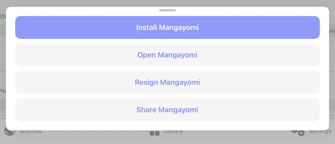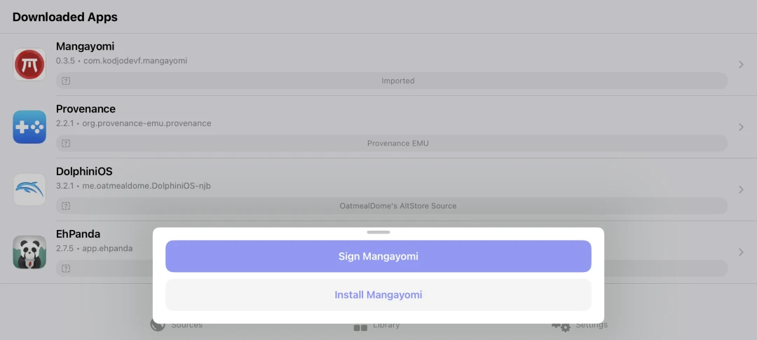 接著到Library頁面,點選右上角+號匯入IPA,例如我要用的是Mangayomi