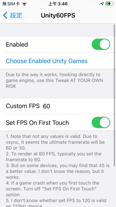 安裝之後,開啟系統設定,滑到最下面找到Unity60FPS的設定。