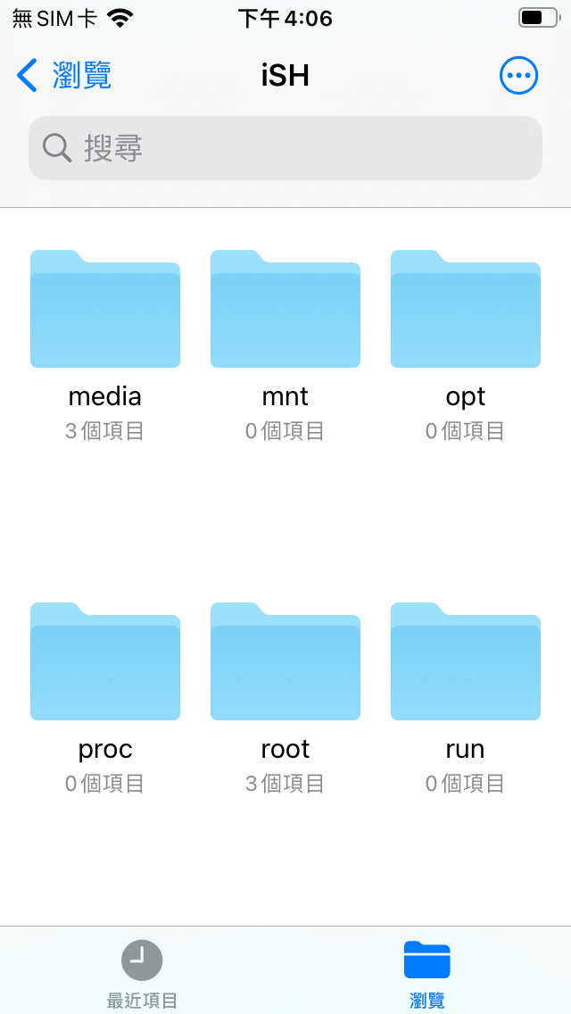 iSH安裝之後,開啟「檔案」App可看到iSH內部的Linux檔案系統。你可以把其他APP的檔案複製到/root/資料夾給iSH Shell存取。