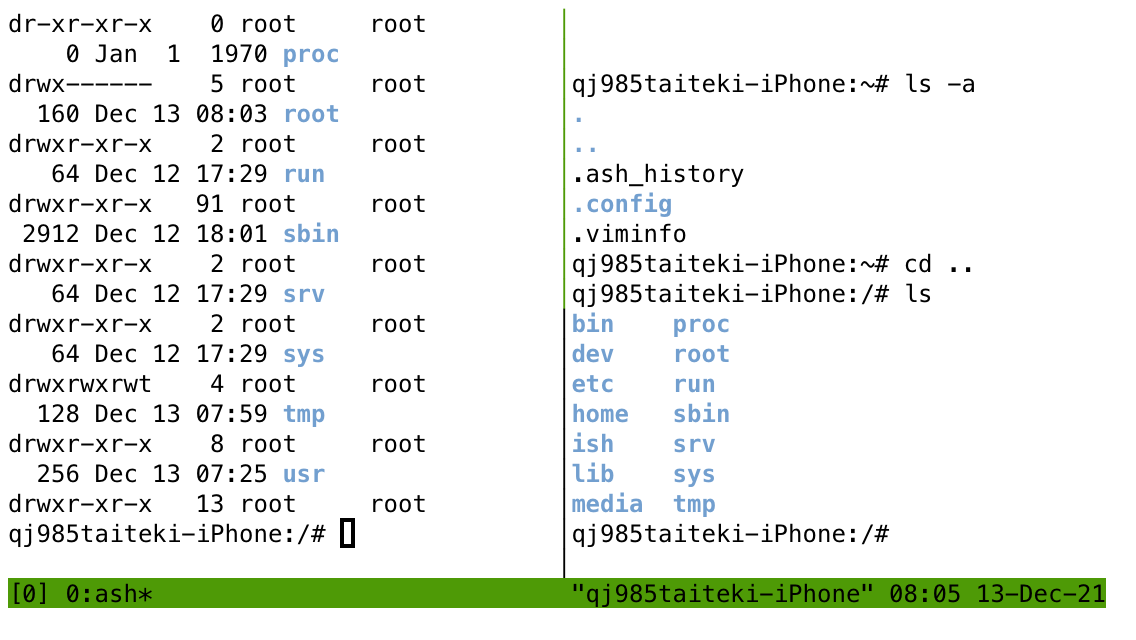 iSH Shell畢竟是普通APP,沒有越獄功能,所以只能看到自己的檔案系統,以及部份iOS APP所分享的資料夾。