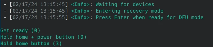 在palera1n終端機按Enter,4秒後按開機鍵+Home鍵,它會嘗試讓iOS裝置重開機,然後開始越獄。如果沒反應,將iOS裝置線拔掉,再馬上插回去。