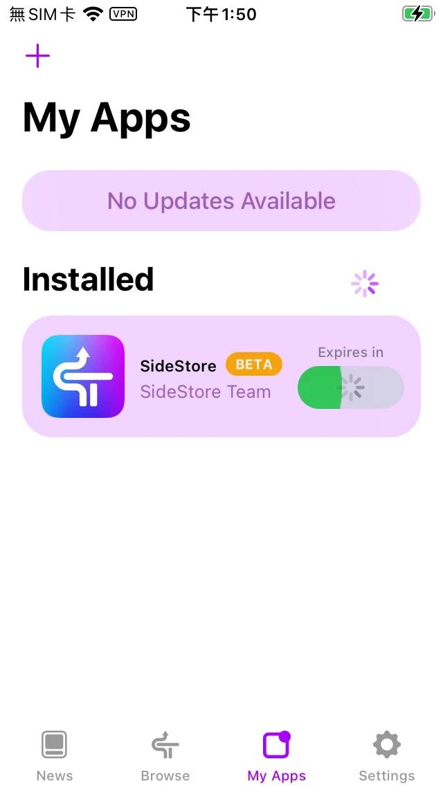 SideStore可透過內建的「Browse」頁面安裝APP,或者點選「My Apps」左上角+號安裝IPA。安裝過程只需開著VPN,無需連到電腦。