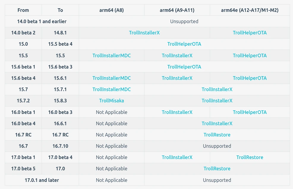 如下圖所示,撰文時點iOS 14、iOS 15、iOS 16的裝置比較有機會裝TrollStore。其餘顯示Not Applicable和Unsupported的裝置就是不支援。
