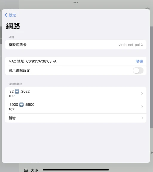 UTM虛擬機預設網路無法從外部存取。編輯Alpine Linux虛擬機網路設定,新增通訊埠轉送,把虛擬機內部的22通訊埠導向localhost的2022通訊埠,這樣虛擬機的SSH服務才能從外部連線。若果Docker服務有用到通訊埠也請一併開啟。
