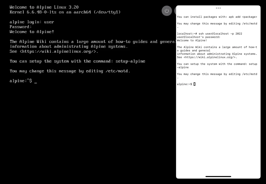 假設你覺得UTM的tty畫面太醜,那就用iSH Shell的ssh登入Alpine Linux虛擬機操作,還能用scp指令傳輸檔案。