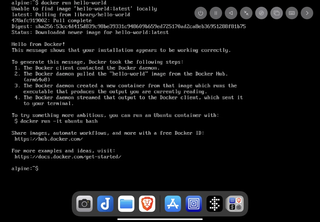 我依然選用Alpine Linux,本身就是一個輕量的發行版,最低只要128MB RAM就能安裝,開機速度很快,安裝速度也很快。雖然UTM虛擬機啟動時間比iSH Shell要多上幾分鐘,但是環境相對完整,起碼QEMU對x86指令的支援度要比iSH Shell好多了。UTM執行指令的回應速度約5秒,所以是足夠跑一些純文字工具的,例如ffmpeg、ImageMagick、完整的Python-pip環境,寫寫小程式,當然還有Docker。