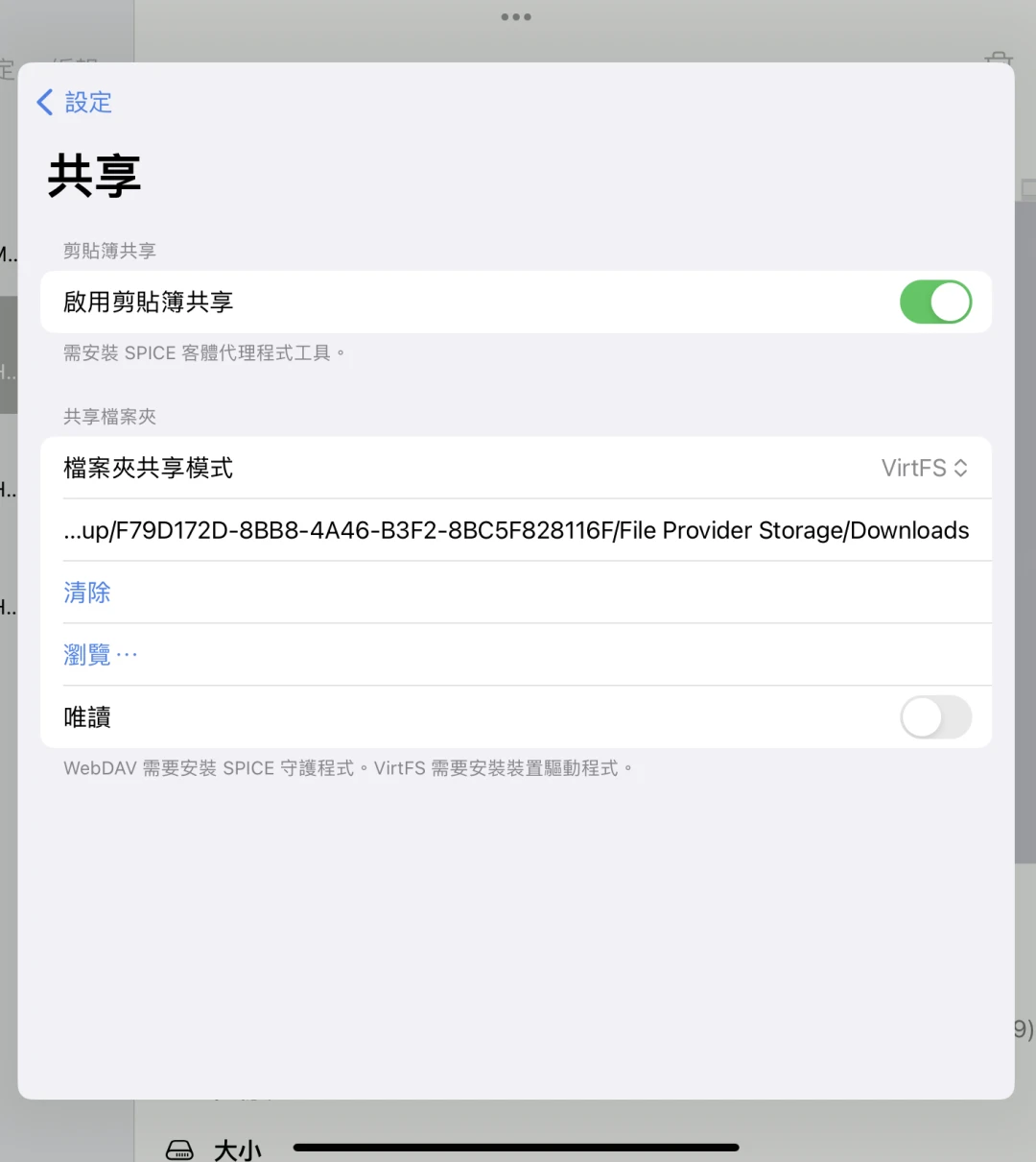 編輯UTM虛擬機,到共享資料夾啟用VirtFS (9Pfs),掛載iOS的「下載」資料夾給虛擬機存取。