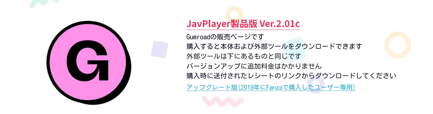 JavPlayer有分體驗版(体験版)和完整版(製品版),後者要在Gumroad花1200日幣購買。購買之後,作者會透過電子郵件定期寄送更新版下載連結。