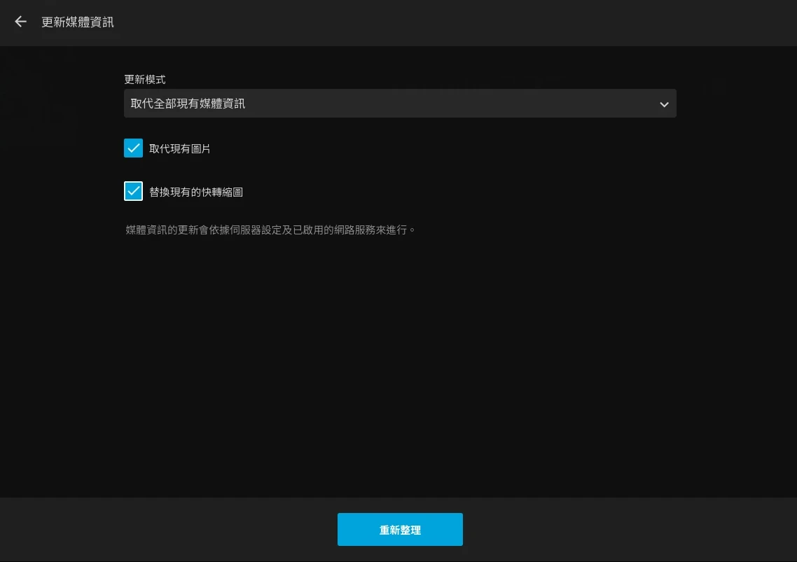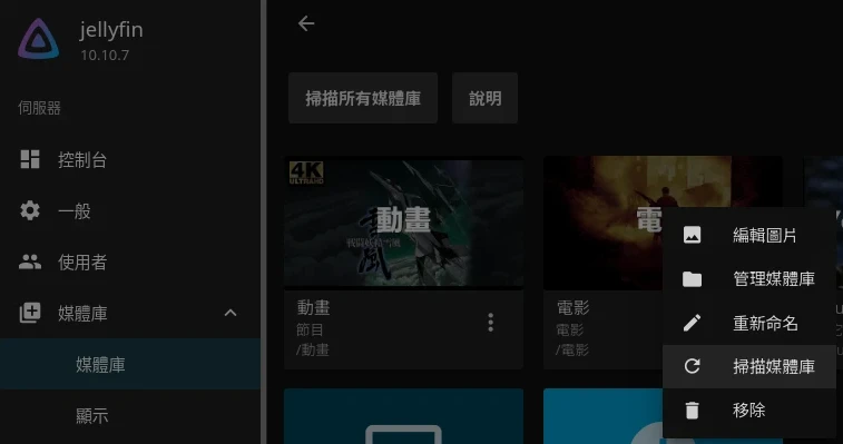 如果Jellyfin在第一次掃描的時候抓錯影片封面,請在修正檔案名稱後,到設定 → 控制台 → 媒體庫,點媒體庫旁邊的三個點,按下掃描媒體庫,並勾選取代現有媒體資訊與縮圖。或者移除媒體庫,重新加入再掃描。