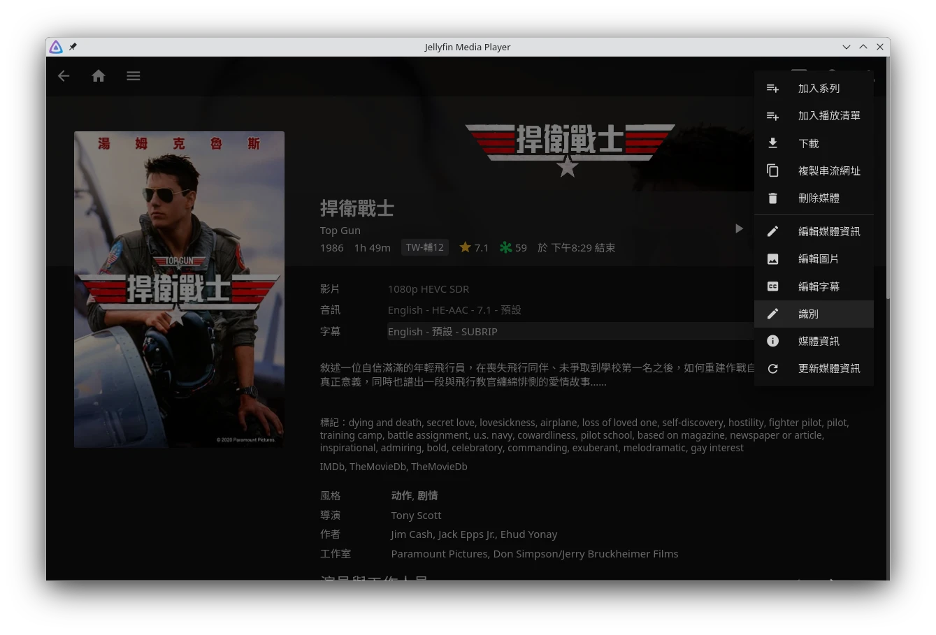 需要注意的是,TheMovieDB的網址有嚴格區分電影與電視節目,Jellyfin也遵照此規則。所以一個「電影」的媒體庫若同時包含電影與電視節目的影片,Jellyfin就會找不到電視節目的中繼資料。此時你只得把二個檔案分開放。