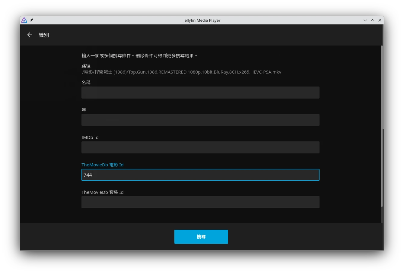 在這裡貼上搜尋條件。直接貼上TheMovieDB網頁顯示的ID來搜尋比較快。例如Top Gun (1986)的網址是