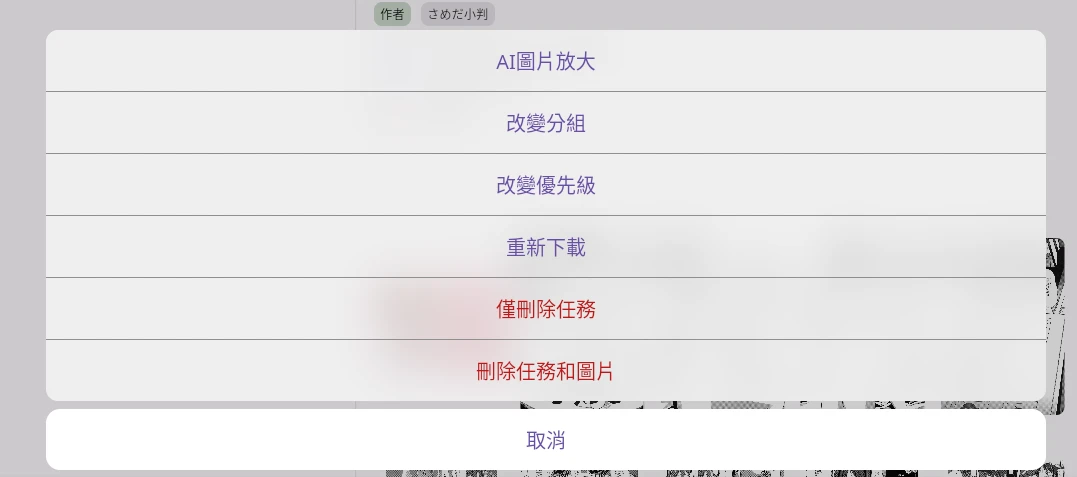 進入已下載的漫畫頁面,對圖片點右鍵 → AI圖片放大,開始處理圖片。處理後的圖片會放到該漫畫下的子目錄,閱讀漫畫會優先載入放大後的版本。