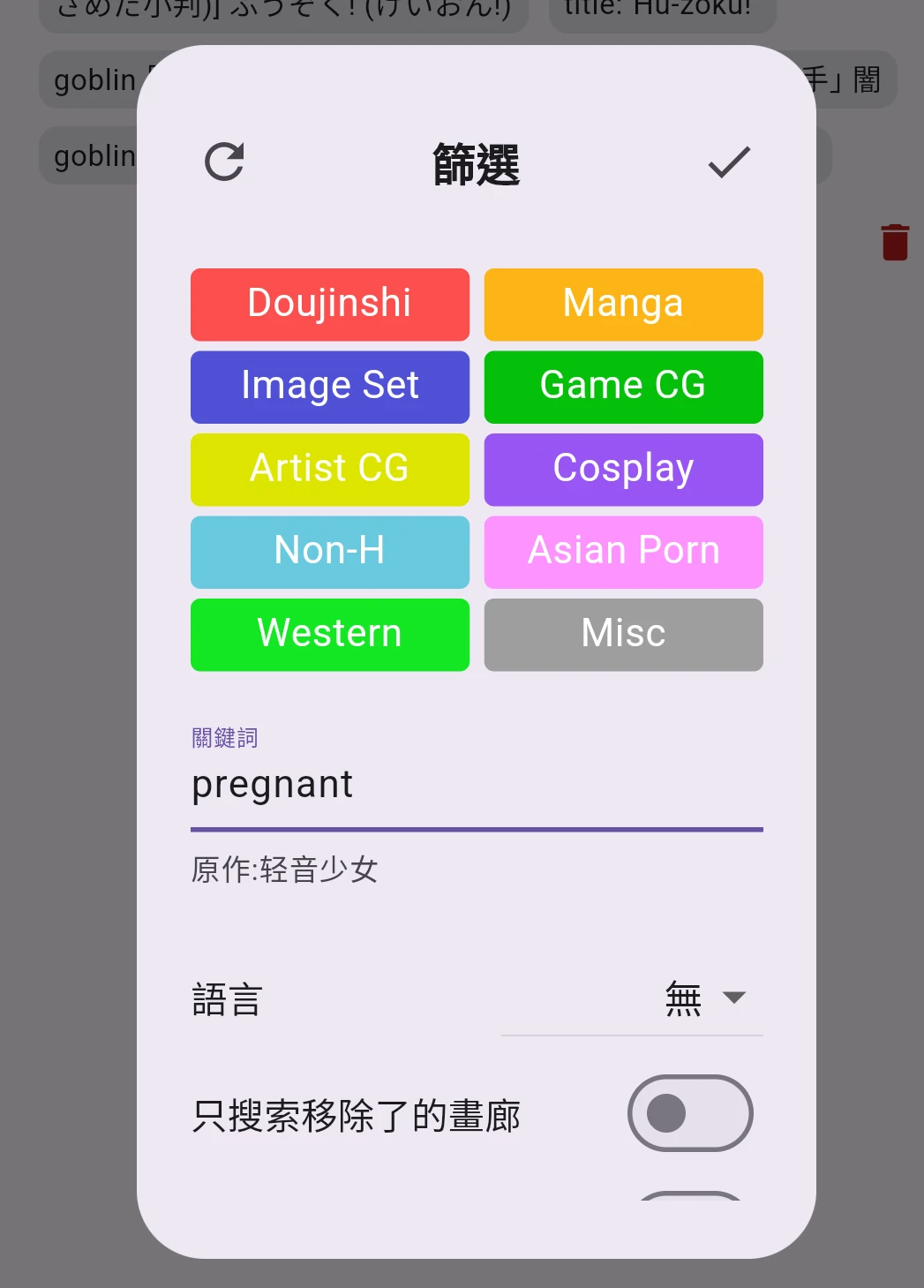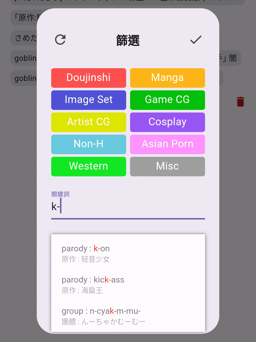 JHenTai搜尋是點選右上角漏斗。輸入關鍵字,就會跳相關標籤出來。關於E-hentai的搜尋技巧請見這篇。
