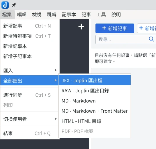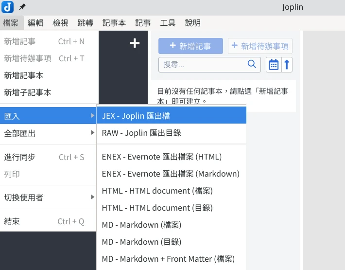 之後開啟空的Joplin,初始化同步到新目錄,再將JEX匯入回來。如此一來才能完成遷移。