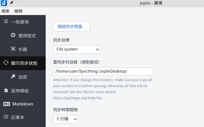 /home/user/Syncthing/Joplin開啟資料清空的Joplin, 點選工具 → 選項,同步目標點選檔案系統
