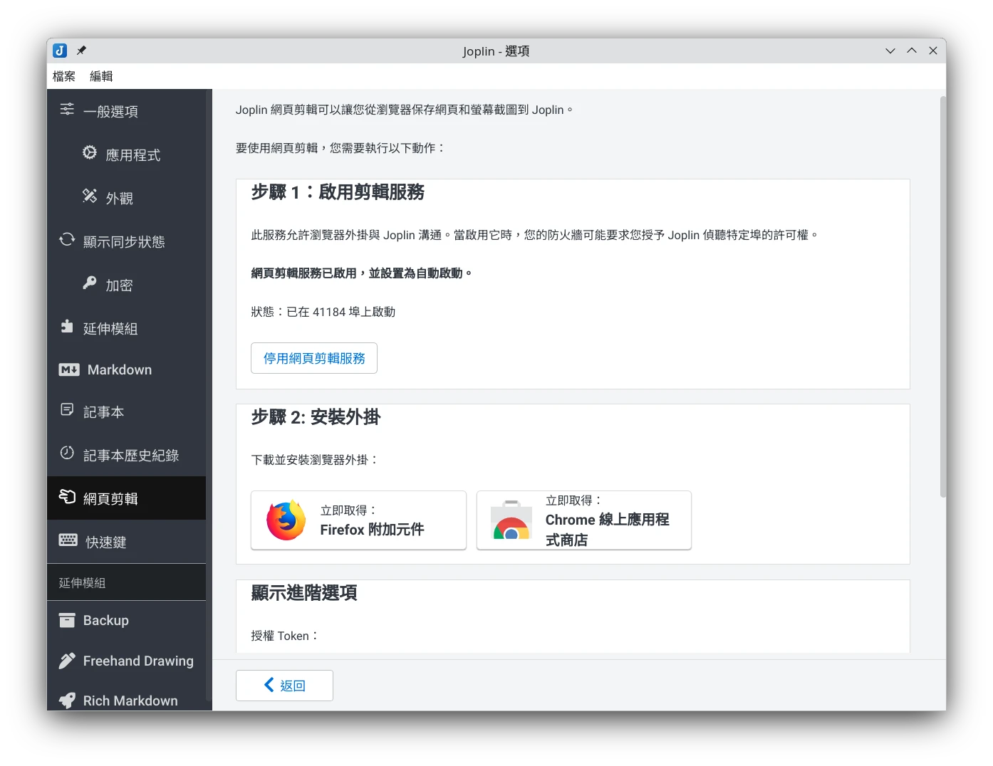 開啟Joplin,點選工具 → 選項,啟用網頁剪輯