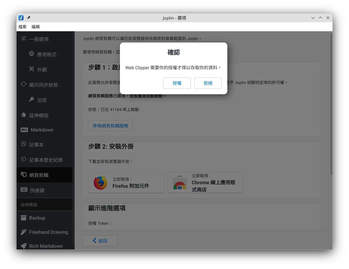 瀏覽器點一下Web Clipper擴充套件圖示,並於Joplin同意存取資料。
