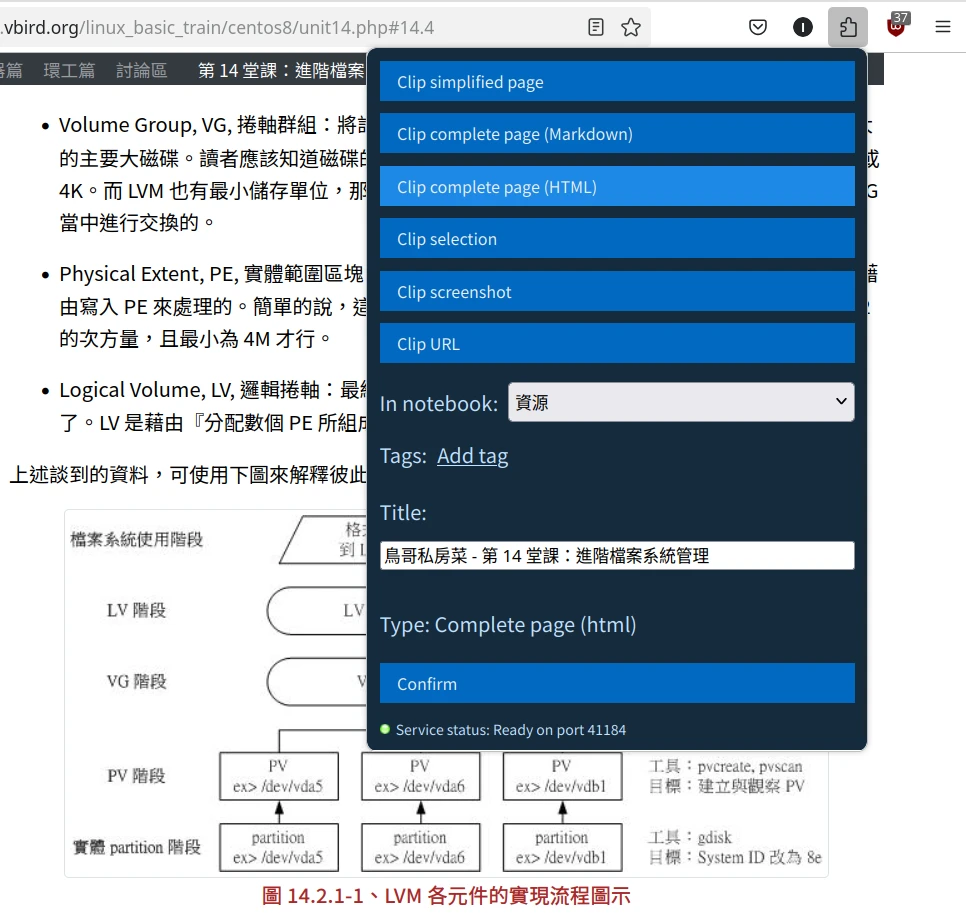 找到要儲存的網頁,按Web Clipper圖示,選取格式,並選取筆記本,按Confirm儲存網頁。Web Clipper會嘗試將網頁中的圖片全部下載,再嵌入Joplin筆記。所以不用擔心網站日後下線導致圖片404。