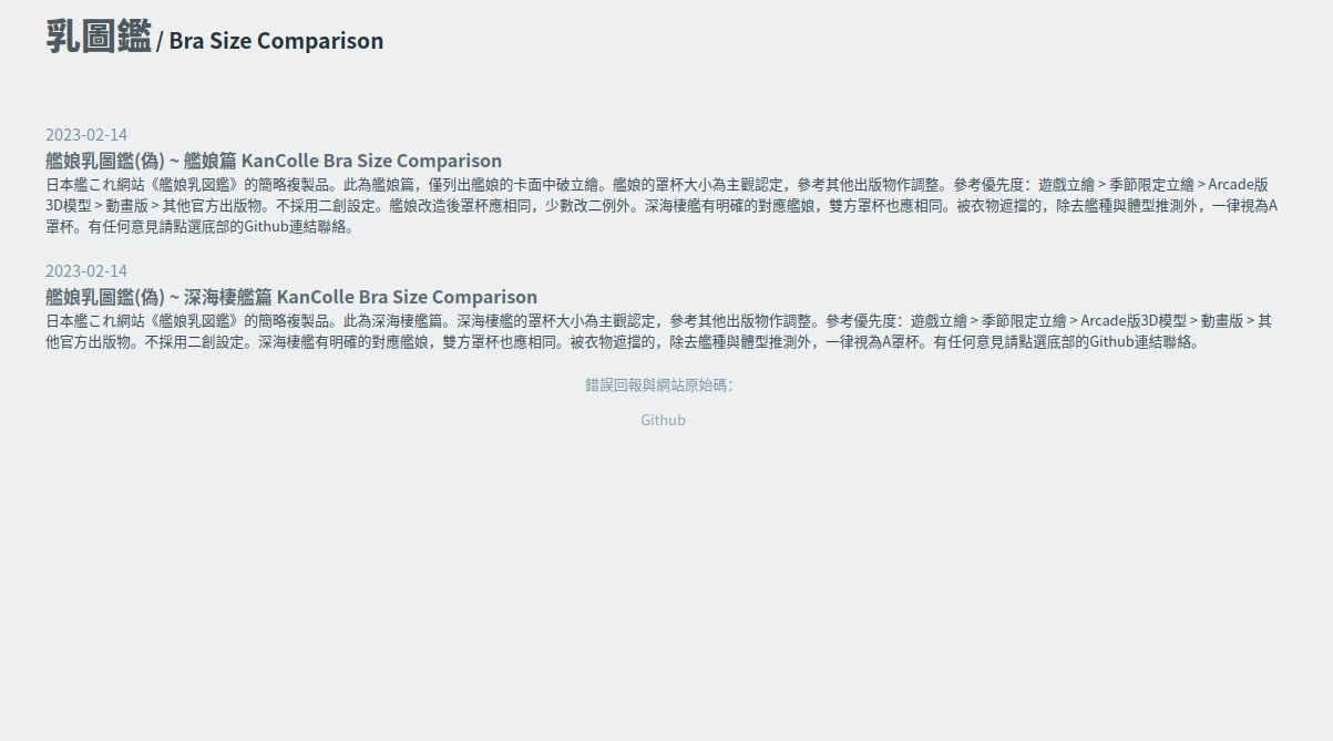 然而最近《艦娘乳図鑑》網站不知為何進不去了,所以我自己做了一個窮人版的仿冒品練練手,稱為:《艦娘乳圖鑑(偽)》