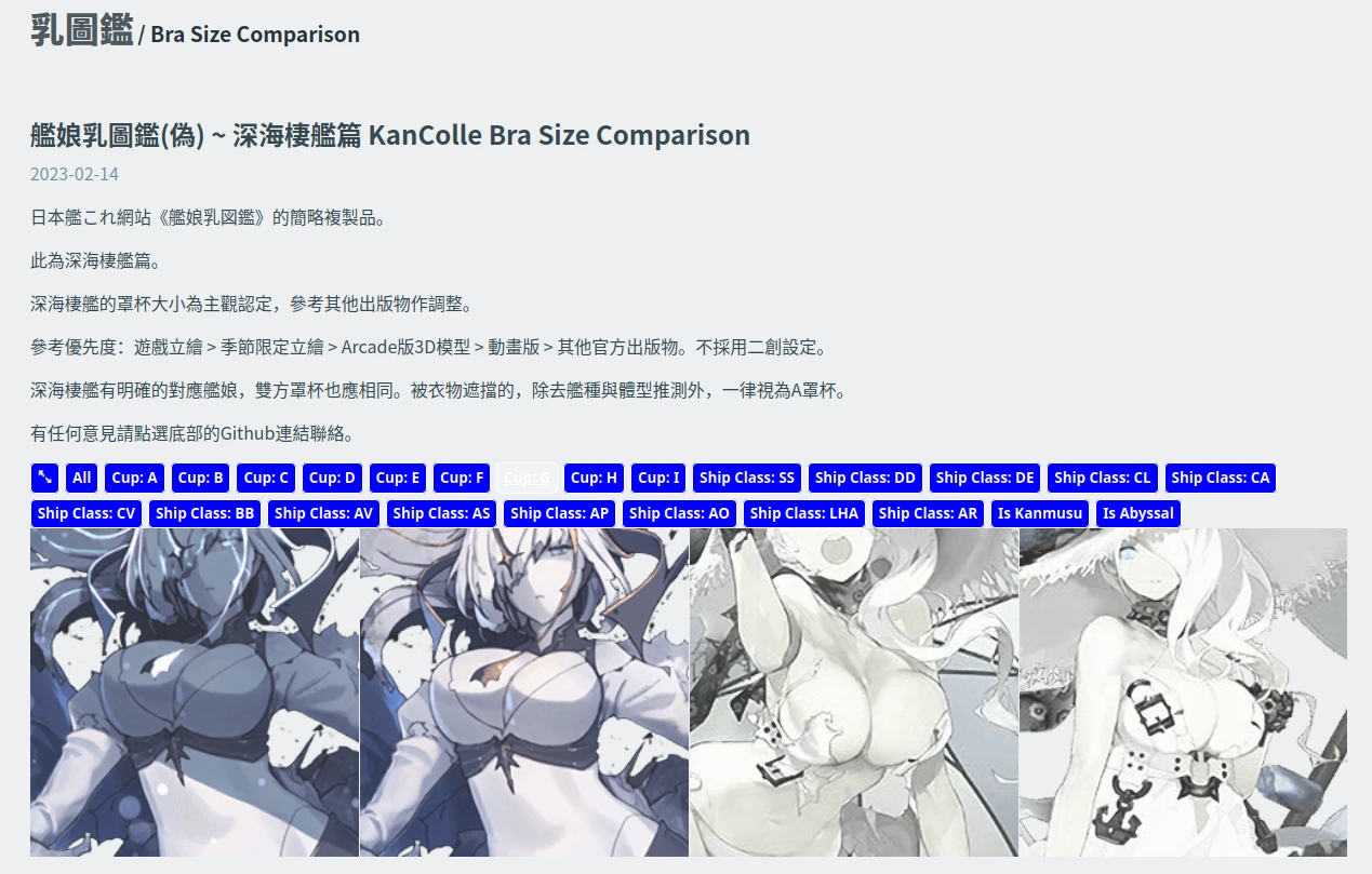 《艦娘乳図鑑》網站縮圖是艦娘胸部特寫,透過拉桿來篩選艦娘罩杯,點選之後會出現全身圖。