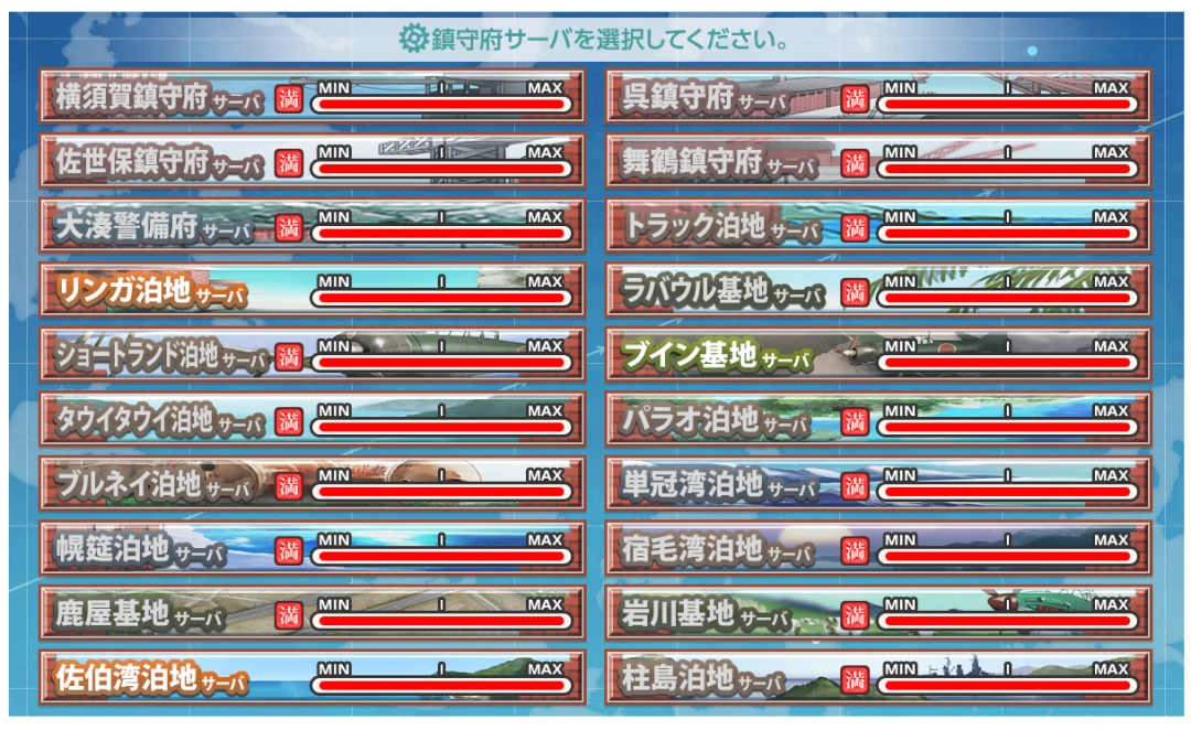 進入遊戲,選擇沒有寫「滿」的伺服器。各伺服器的差異是人數多寡,會影響每月打戰果(遊戲戰力排名)的難易度,像「柱島泊地」最多人,排名最難打。