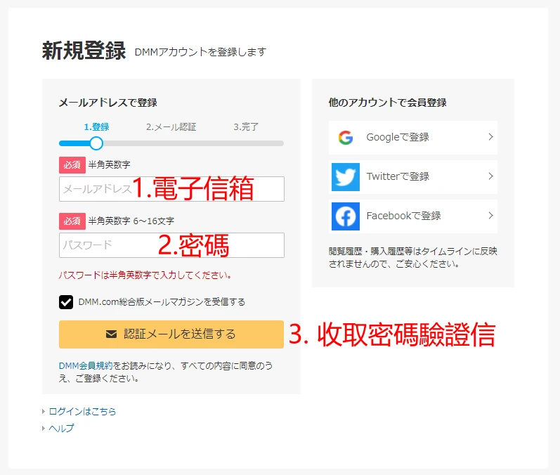在「新規登録」頁面,在第一個欄位填寫email,第二個填寫密碼。按下「認証メールを送信する」收取驗證信。