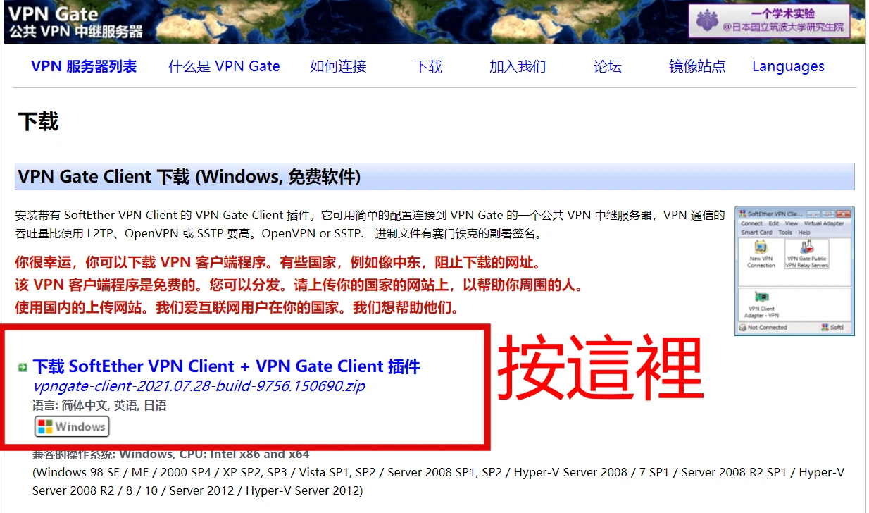 然後要掛VPN到日本,我使用筑波大學的VPN Gate,這是開源公益專案。到官網下載。