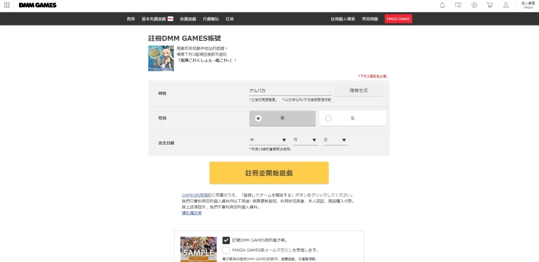 接下來要註冊DMM帳號。如果因為玩過賽馬娘之類的已經有DMM帳號,請還是掛著VPN,跳到跑完新手教學的部份。
