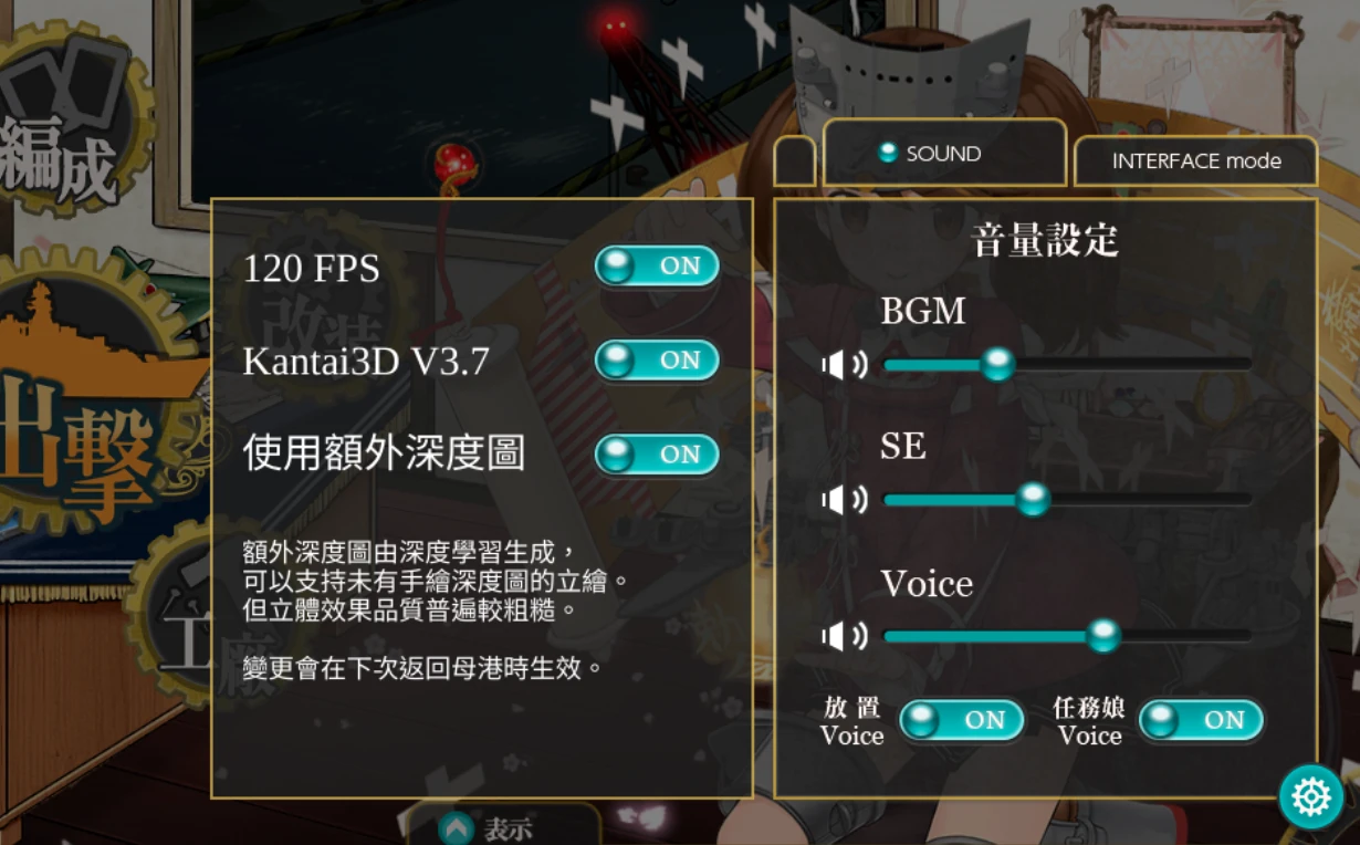 裝好模組進入遊戲,遊戲設定會多出一個界面可以開關Kantai3D,開啟後重新進入母港生效。