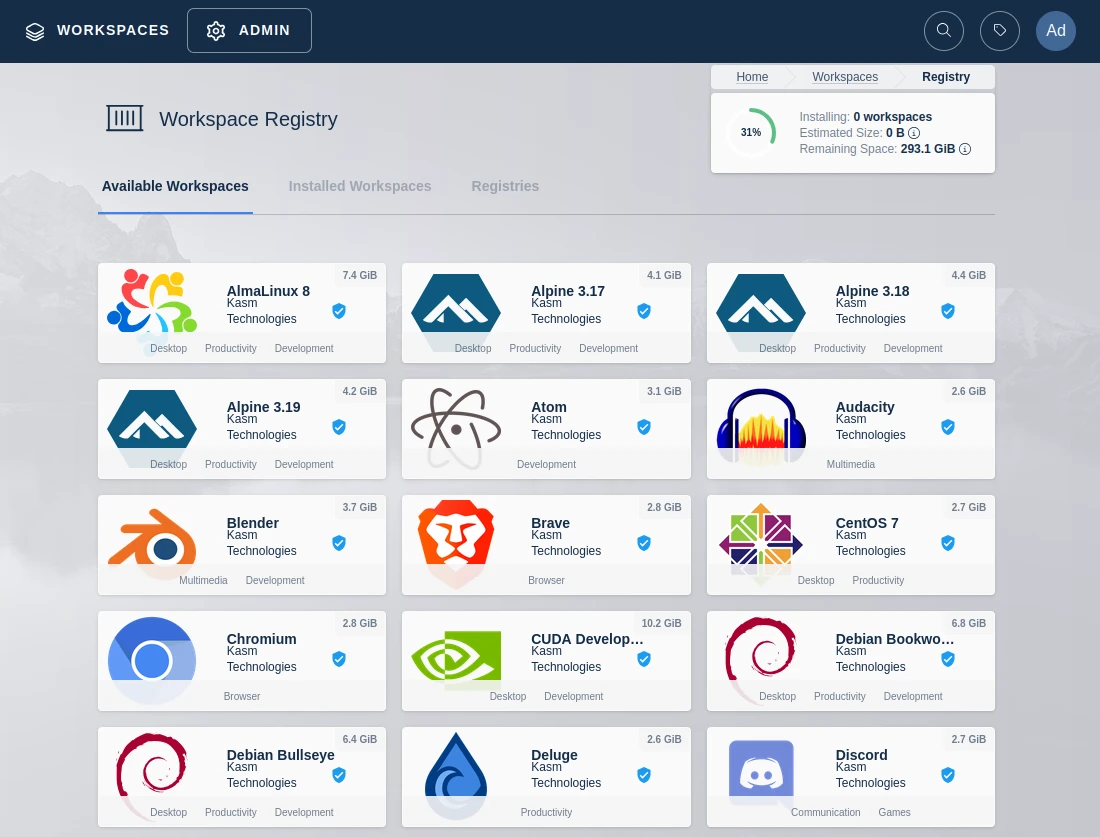 用管理員帳號登入後台,到Workspace Registry頁面,下載其他Linux發行版的桌面,或者單一應用程式。