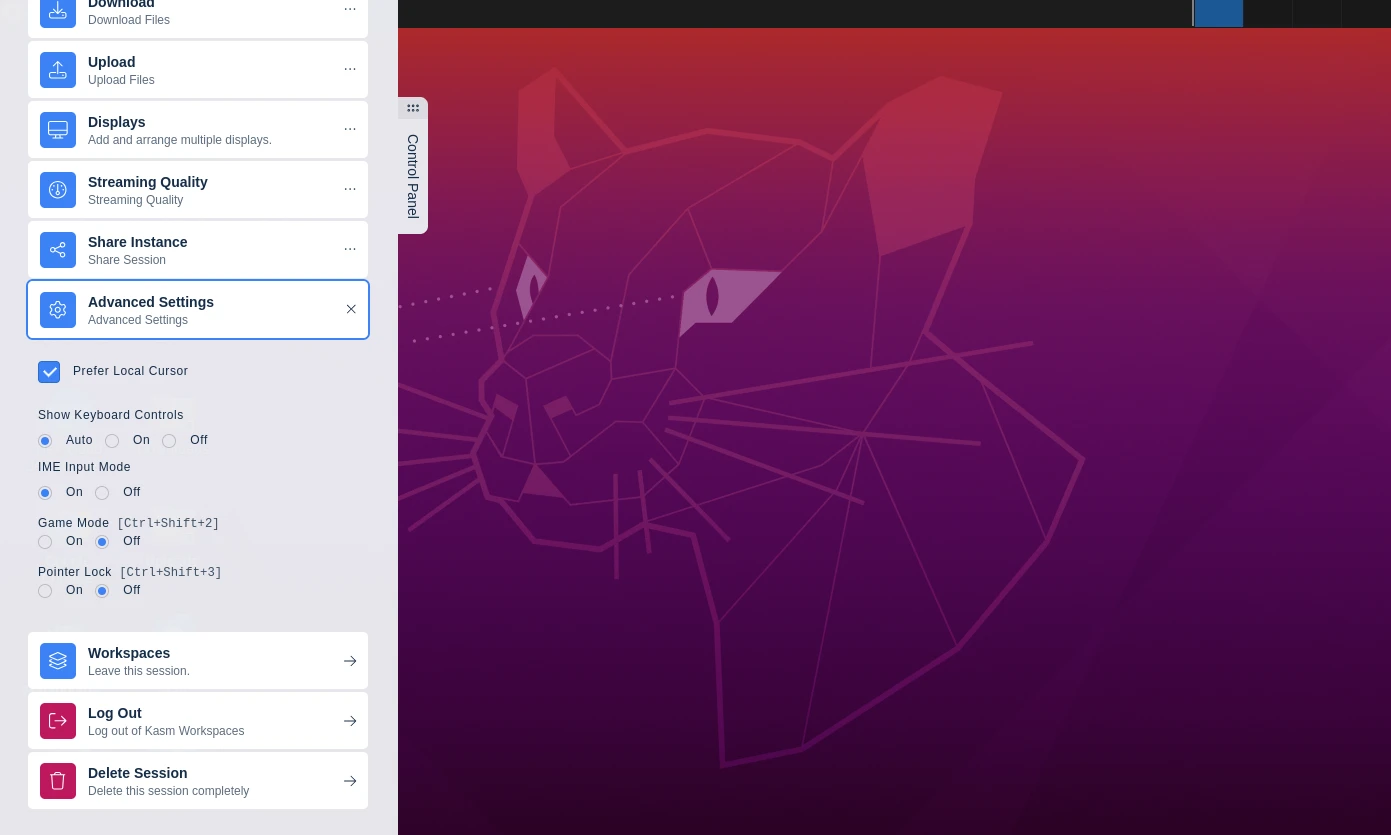 - Kasm只要有瀏覽器就能存取。遠端桌面使用KasmVNC串流畫面,操作類似Apache Guacamole但功能更強,支援播放音訊、存取攝影機、錄音、共享剪貼簿、上傳檔案、虛擬多螢幕。