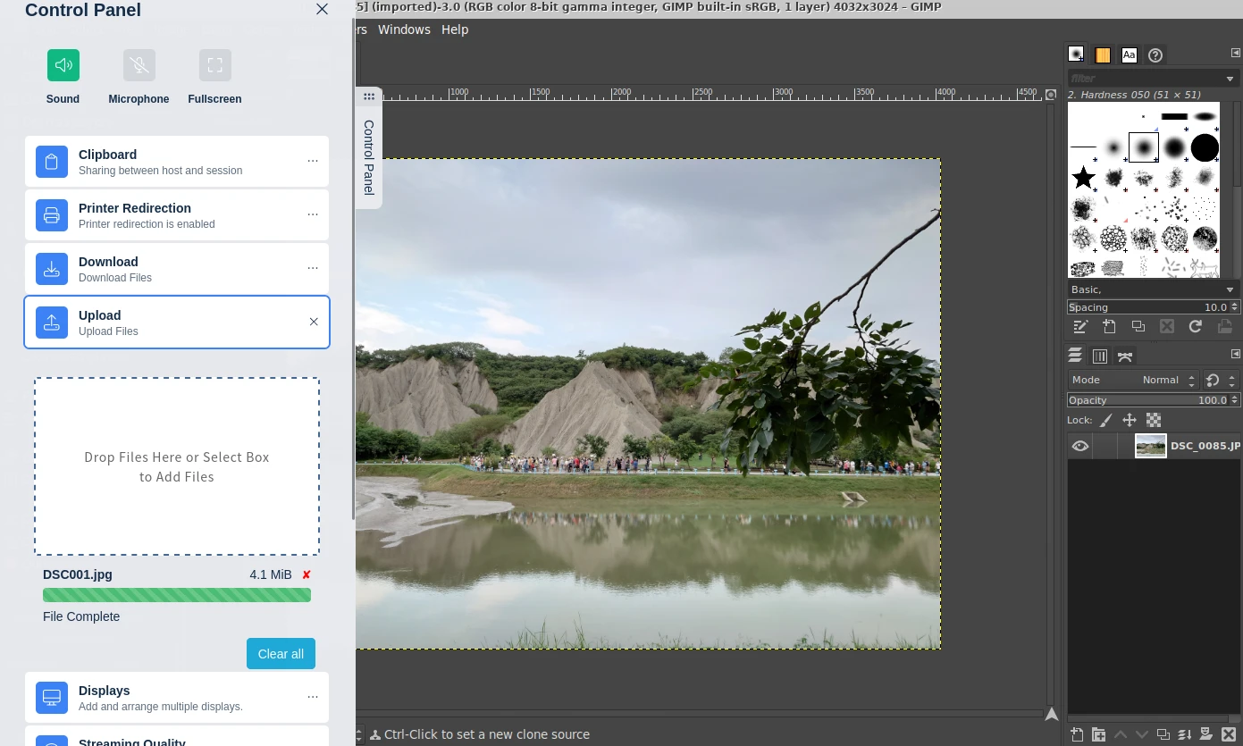 例如我這裡開了GIMP,要載入素材就是利用Kasm的上傳功能,從本機上傳檔案到遠端的Uploads目錄,就能夠編輯了。