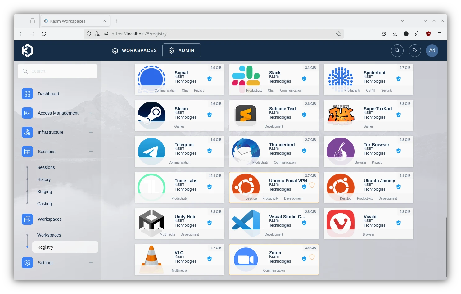 我想,Kasm的最大優點就是開箱即用,並提供一個靈活管理多個使用者的界面了吧。Kasm還有一個註冊表界面,方便你下載需要的應用程式,就像App Store一樣。