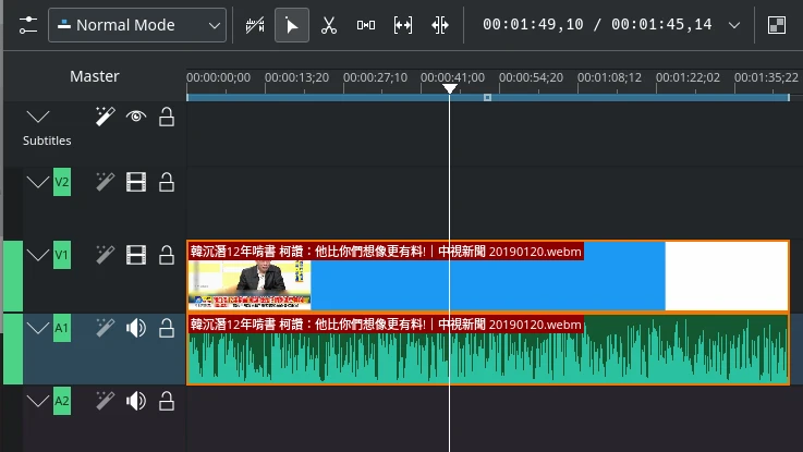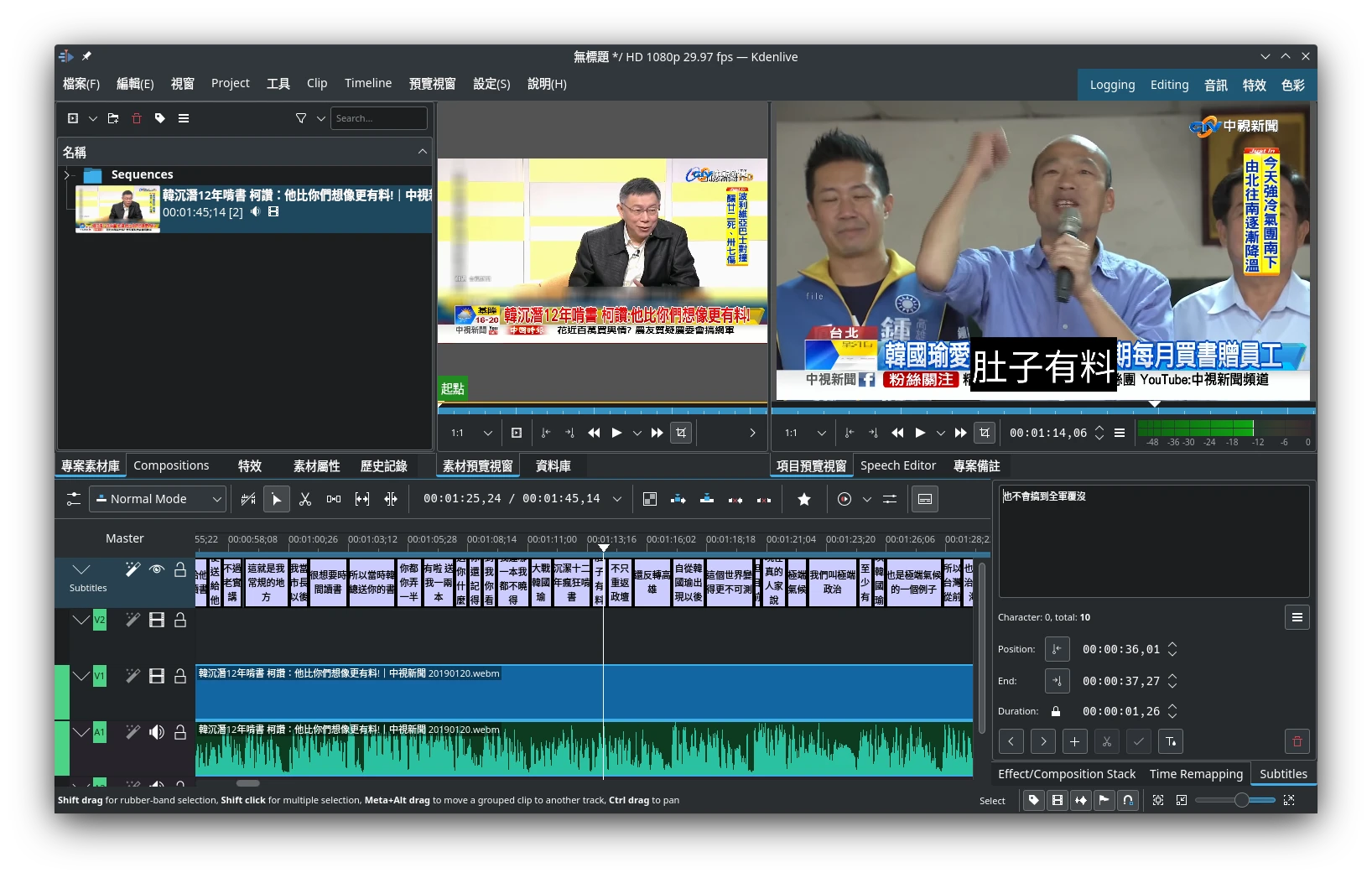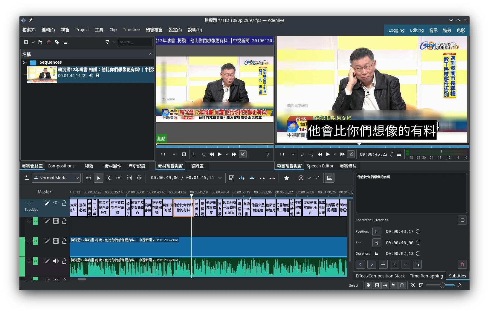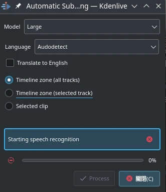 字幕會直接匯入到Kdenlive的軌道。如果生成的字幕不理想,建議改用更大的模型。