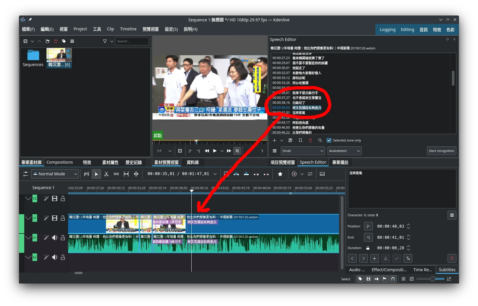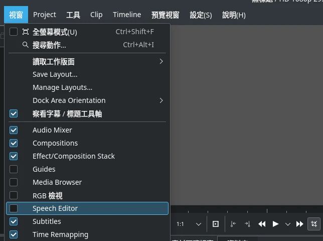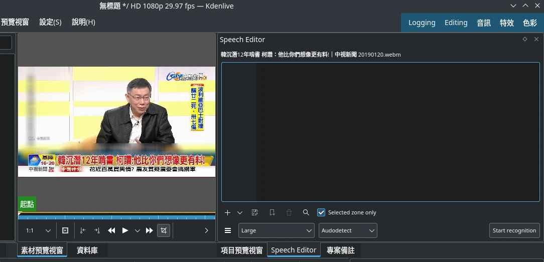 語音轉文字技術Linux與Windows皆可使用,詳官方使用手冊:Speech to Text — Kdenlive Manual
