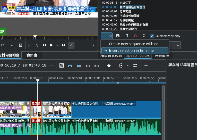 Insert selection in timeline則是按照逐字稿的時間軸內容,將該片段的影片插入到時間軸。Create new sequence with edit會生成一個按照逐字稿的時間軸下去切割的影片序列(sequence)。