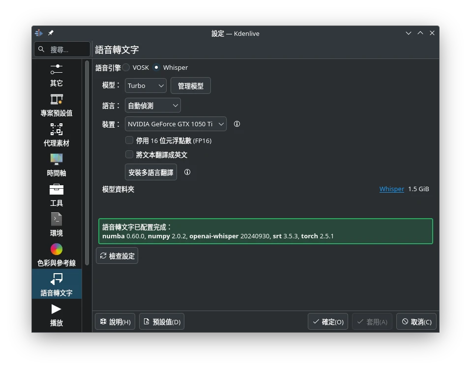 開啟Kdenlive,點選上方設定 → 設定Kdenlive → 語音轉文字。點選「安裝多語言資料」,等待Python依賴套件與模型全部下載完成,大約會佔用10GB空間。