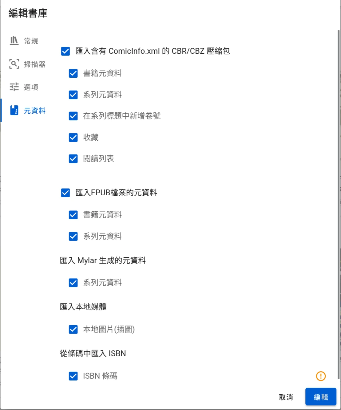 關於掃描選項,Komga的中繼資料不會從線上資料庫抓取,而是完全使用本機資訊,譬如ComicInfo.xml。如果想更精確的紀錄閱讀紀錄的話,勾選ISBN,讓Komga從漫畫中辨識書號。