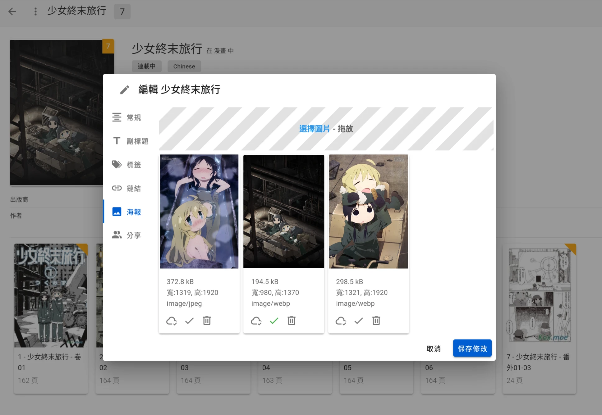 在閱讀界面點選標題開啟漫畫系列。在中繼資料編輯面板這裡有個功能很不錯,就是能夠讓你上傳漫畫相關的海報或者插圖,方便蒐藏相關精美資源。不過不知道為何作者要限制上傳檔案大小。