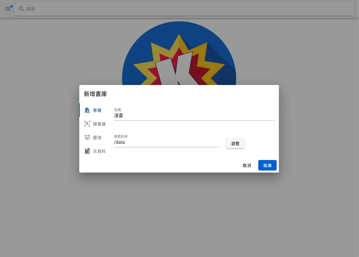 依照指示,新增書庫,「根資料夾」輸入漫畫所在的目錄。這裡可以新增很多個書庫,如果你有很多類型的漫畫是分開放的,而非都放在同一個目錄下的話,就重複此步驟,分別新增各個目錄。